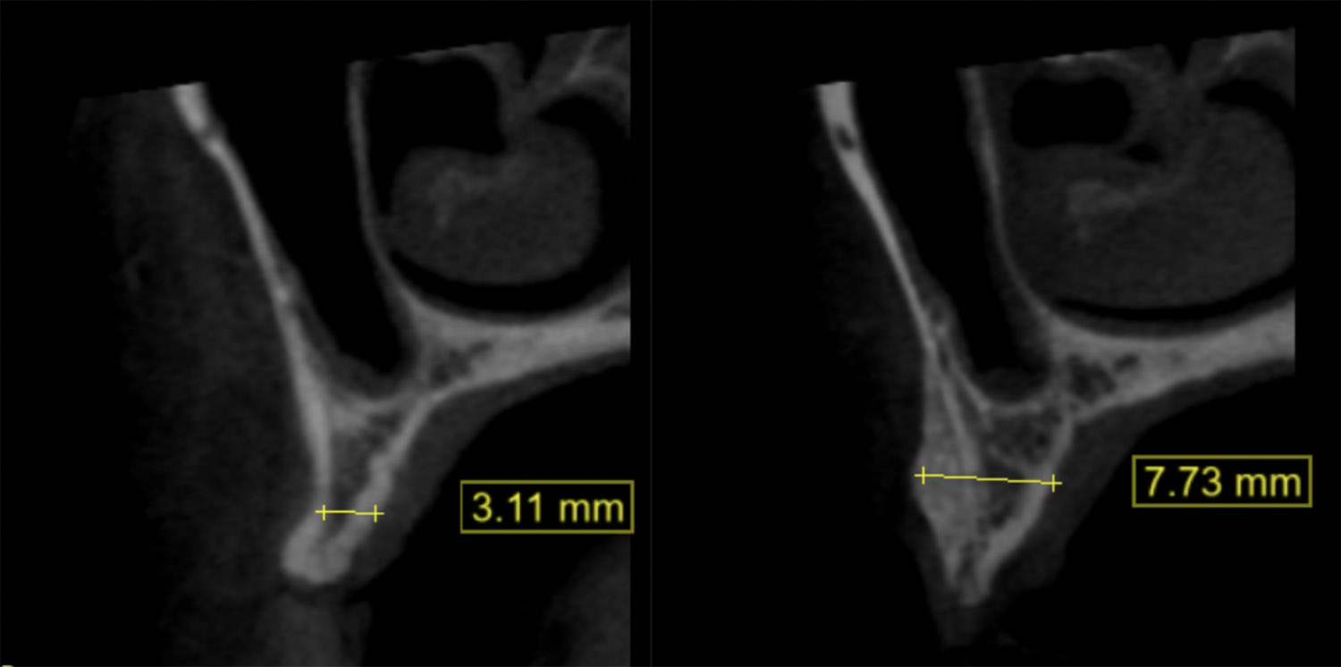 左圖代表的是補骨手術前的電腦斷層圖,可以看到最窄的部分寬度只有約3釐米,右圖是補骨手術後6個月的電腦斷層圖,骨頭的寬度有顯著的成長到7釐米,為後續的植牙品質提供良好的保障。